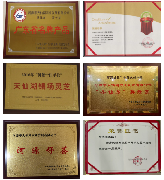 公司研發(fā)部被認定為“河源市農(nóng)業(yè)科技創(chuàng)新中心”與“河源市仙湖茶葉工程技術(shù)研究中心”。從2007年起,公司與廣東省農(nóng)業(yè)科學院蔬菜研究所建立產(chǎn)學研合作,研發(fā)出了“一種紫靈芝的栽培方法”、“一種能大量減少木材消耗的靈芝栽培方法”發(fā)明專利,并獲得“炒茶裝置與一種食材粉碎機”新型發(fā)明專利證。在不斷創(chuàng)新生產(chǎn)技術(shù)的同時還致力于打造質(zhì)量過關(guān)、品質(zhì)優(yōu)良的產(chǎn)品,生產(chǎn)的靈芝產(chǎn)品獲得商標注冊證,且被國家農(nóng)業(yè)部認定為綠色食品,2008年,生產(chǎn)的靈芝茶產(chǎn)品在河源市首屆現(xiàn)代生態(tài)農(nóng)業(yè)推介暨農(nóng)產(chǎn)品展銷會上獲“優(yōu)秀農(nóng)產(chǎn)品獎”稱號;2009年,被23屆世客會指定為接待用茶,2010年被省農(nóng)業(yè)廳評為“廣東省名牌產(chǎn)品”,2014年獲河源市第二屆“農(nóng)業(yè)金牌產(chǎn)品”稱號,2016年天仙湖錫場靈芝被評為“河源十佳手信”;2017年公司茶葉被評為“河源好茶”;2018年,圣仙湖牌綠茶評為“十佳好禮” ;2021年評為“廣東省現(xiàn)代農(nóng)業(yè)產(chǎn)業(yè)園百佳手信”產(chǎn)品獎。